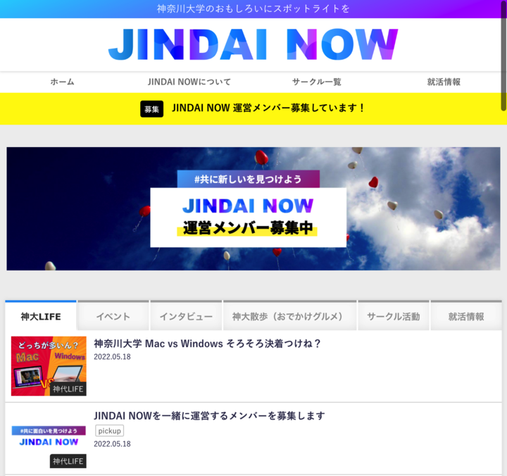 JINDAI NOWはサークル・部活動情報、ゼミ情報、神大周辺のグルメ情報、学食の情報、インタビュー記事、履修に関する情報、就活情報等の神奈川大学生の学生生活に役立つ情報発信を行ってまいります。