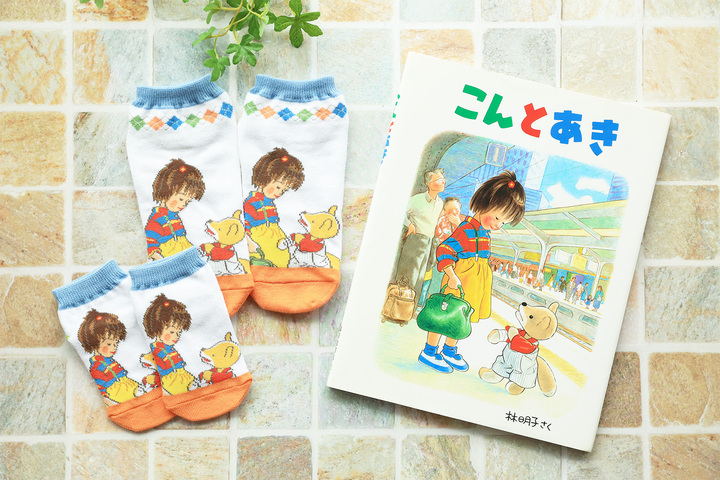 ぬいぐるみの「こん」と女の子「あき」の冒険を描いた作品『こんとあき』(出版社:福音館書店)は累計136万部を突破。いつも一緒のこんとあきの物語のように大好きな絵本を身近に感じられる、親子で履ける靴下になりました。
