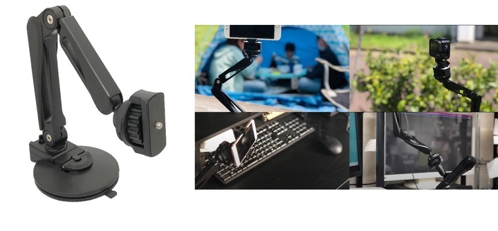 【マルチアームスタンドSC1/4】は以前にMakuakeにて好評いただいた【タブレットアームスタンドS2C】の吸盤/ネジ式クリップの付替えに、新たに先端に1/4ネジを設置することでスマホやカメラなど様々な機器を取り付ける事が可能になる新しいアームスタンドです。