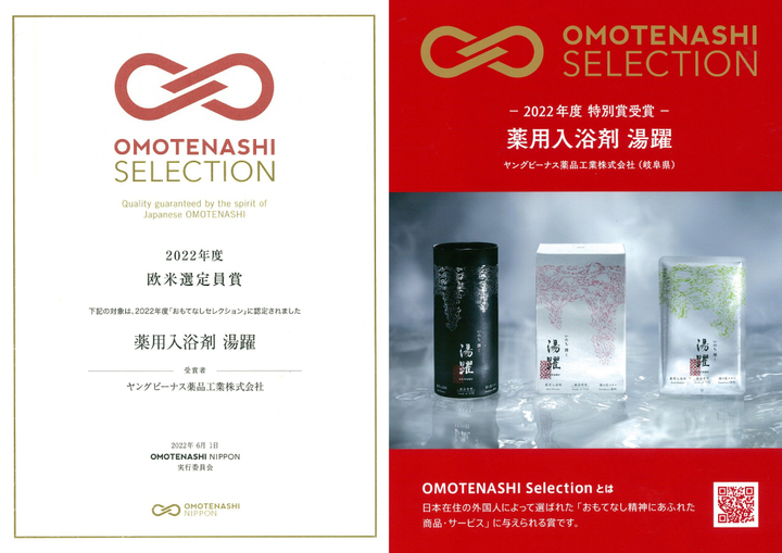 この度 「薬用入浴剤 湯躍」は、日本の優れた“おもてなし”心あふれる商品・サービスとして、世界に広めることを目的としたプログラム「OMOTENASHI Selection」の2022年第1期にて「特別賞」の「欧米選定員賞」を受賞いたしました。日本在住の外国人有識者による現物審査と日本人専門家によるクオリティチェックの結果、高い評価を受け受賞にいたりました。