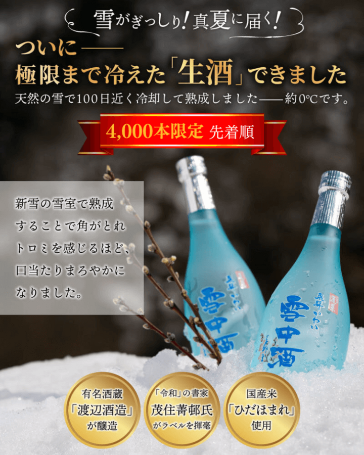 雪中酒は、岐阜県飛騨地方の『天生山(あもうさん)』の湧き水と、国産米『ひだほまれ』から作ったしぼりたて生酒を、雪室で100日近く冷やして熟成させて仕上げた日本酒です。