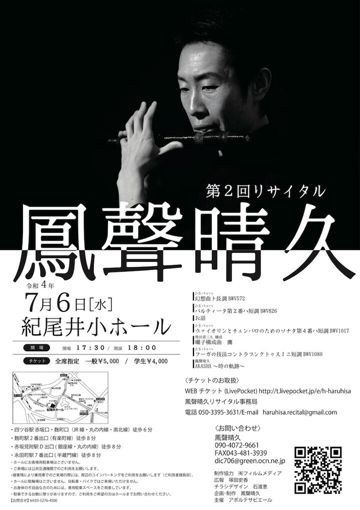 邦楽囃子笛方の鳳聲晴久(ほうせい はるひさ)が、2022年7月6日に紀尾井小ホールで『鳳聲晴久 第2回リサイタル』を行います。邦楽囃子方の晴久は、日本の伝統の和楽器である篠笛で、J.S.バッハの曲に新たなアプローチを試みてまいりました。本公演では、配信公演『Sine termino Antiqua Consulere 2020』のために編成した、洋楽器と篠笛によるバッハの4曲他、新曲『AKASHA―時の軌跡―』をお届けします。