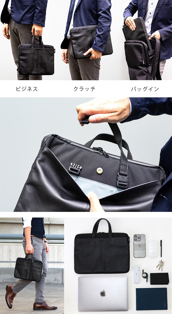 『ビジネス』・『クラッチ』・『バッグイン』と簡単に外せる「持ち手」でスタイルが変更できます。