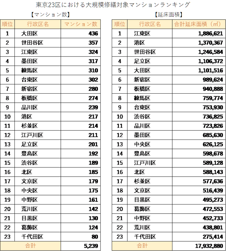 建設業界に特化したマーケティングで40年の実績を持つベーシックインフォメーションセンター株式会社が東京23区における大規模修繕対象になる築10~15年のマンションを独自調査。マンション数においては436件で大田区がトップ、合計延床面積で見ると江東区がトップとなった。