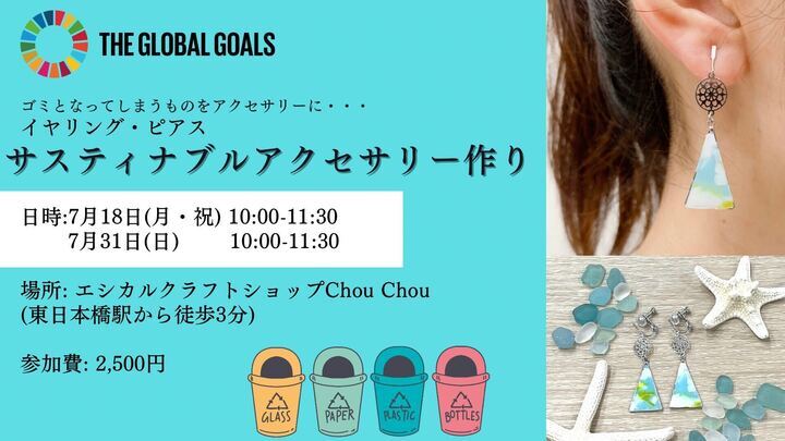 ペットボトルキャップやシーグラスなどの本来は捨てられてしまうものを使ったサスティナブルアクセサリー作りです。