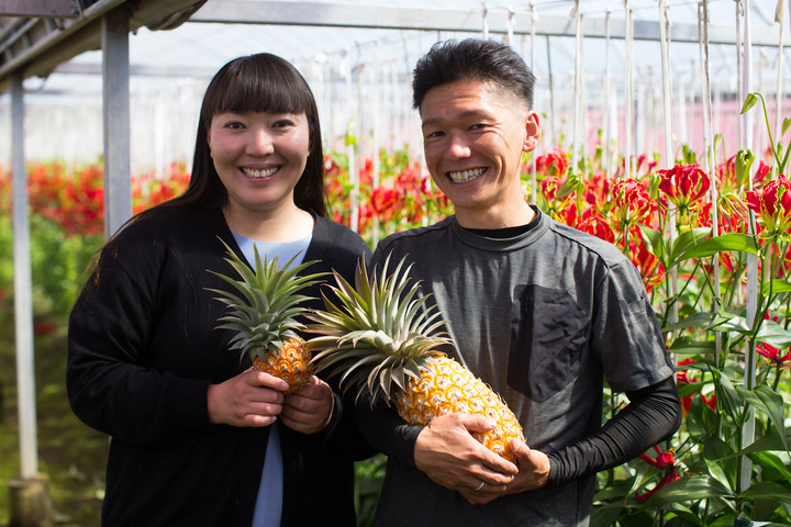 1986年生まれ。高知県高知市出身。家族でグロリオサ、新生姜、米などを栽培する農家を営む。左は、愛妻の真実さん。近年はパイナップルやドラゴンフルーツなど、南国ならではのフルーツ栽培にも挑戦。