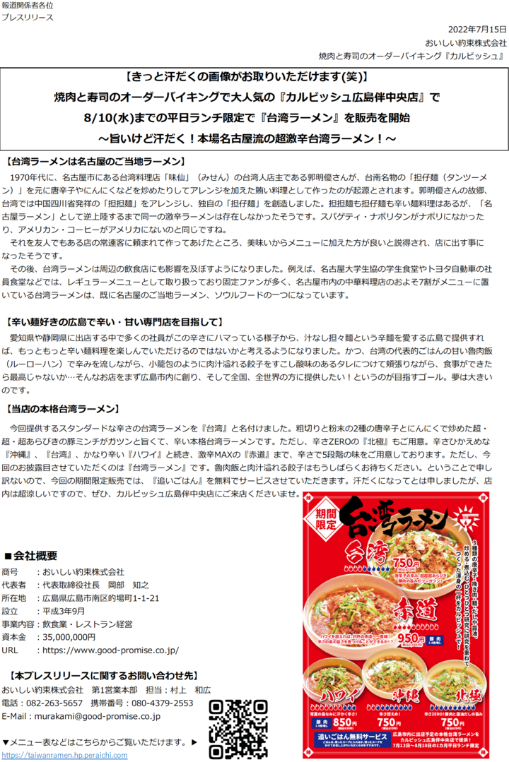 【きっと汗だくの画像がお取りいただけます(笑)】 広島市安佐南区、焼肉と寿司のオーダーバイキングで大人気のカルビッシュ広島伴中央店では8/10までの平日ランチ限定で【激辛台湾ラーメン】を販売しております。スタンダードな辛さの台湾ラーメンを『台湾』と名付けました。粗切りと粉末の唐辛子と粗みじんのにんにくなどで炒めた超・超・超あらびきの豚ミンチがガツンと旨くて辛い本格台湾ラーメンです。この『台湾』でも汗だくでお召し上がりになられるお客様がいらっしゃいます。なお、辛さZEROの『北極』から、『沖縄』、『台湾』、『ハワイ』と続き、激辛MAXの『赤道』まで、辛さで5段階の味をご用意しております。