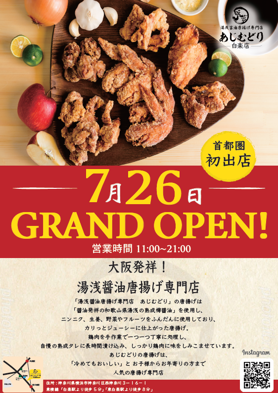 関西人気の唐揚げ専門店「あじむどり」が横浜市神奈川区西神奈川にて「白楽店」を首都圏1号店として、2022年7月26日火曜日にオープンする。(最寄駅 東急東横線:白楽駅 徒歩5分)