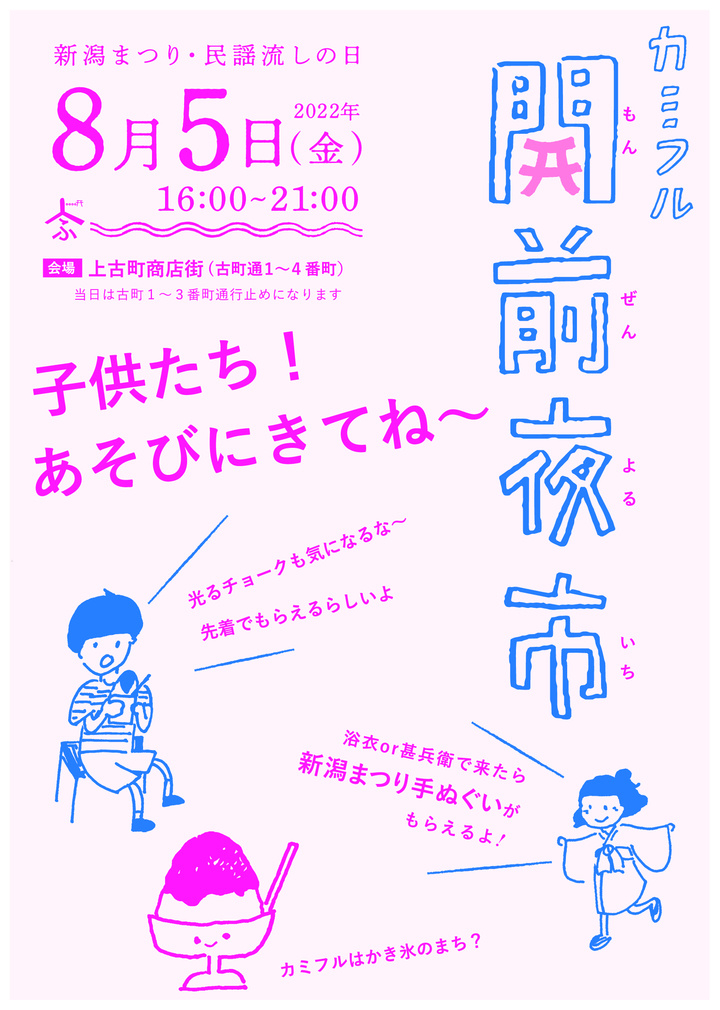 新潟市中央区の上古町商店街振興組合(事務所所在地:新潟市中央区古町通3番町661、理事長:迫一成)は、3年ぶりに開催される新潟まつりの初日8/5に『カミフル門前夜市』を開催します。当日は古町1〜3番町を通行止めにし、子供たちも楽しめる企画を多数企画しています。本事業は新潟まつりを応援する市民参画プロジェクトです。