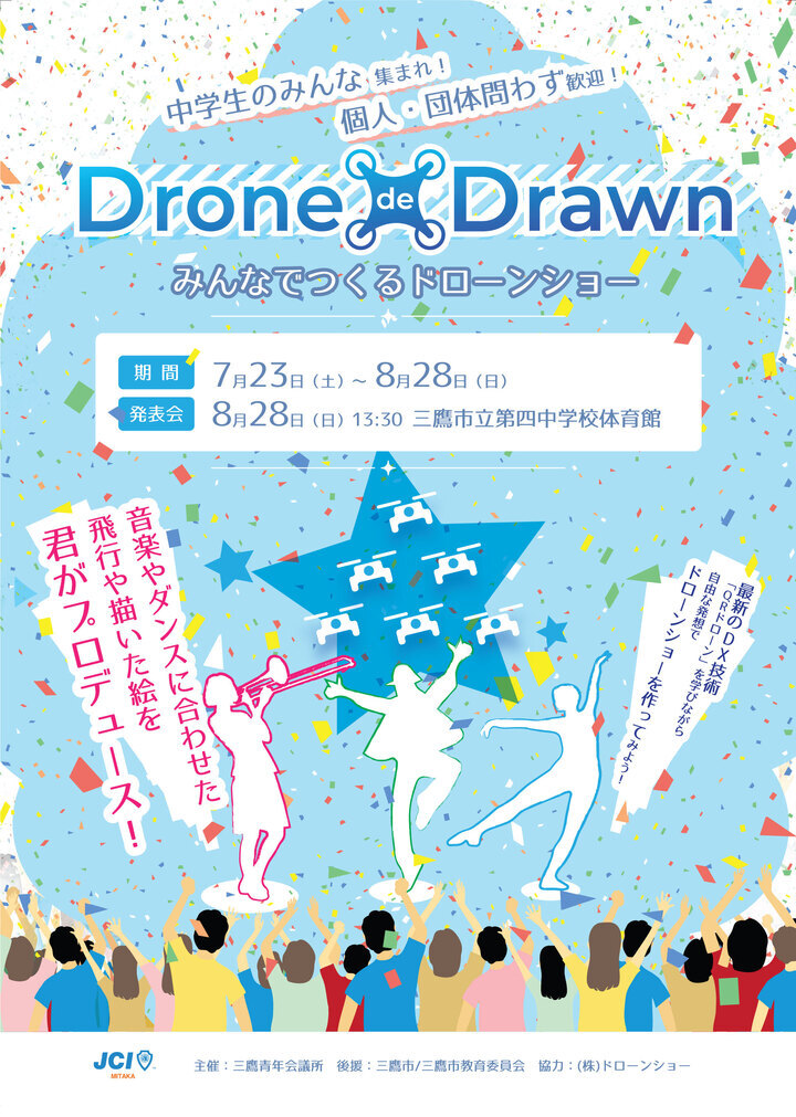 三鷹青年会議所では、8月28日(日)、三鷹市立第四中学校体育館にて、中学生向けの ドローンワークショップ「Drone de drawn みんなでつくるドローンショー」を開催しま す。