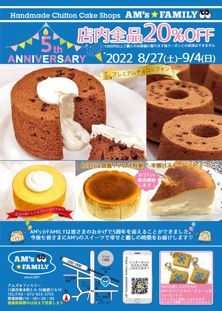 シフォンケーキ専門店AM's FAMILY”5周年感謝祭”のお知らせ 1,000円以上お買い上げで全品20%OFF!