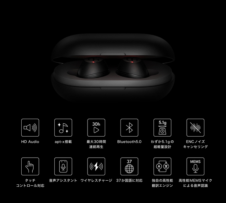 フルワイヤレス(TWS)イヤホンに、リアルタイム翻訳機能を搭載。独自のAI翻訳エンジン「MyJuno」を搭載して、37カ国語のリアルタイム翻訳を実現しました。「MyJuno」のAIはオンラインで情報を収集し、常に翻訳精度を向上させています。左右合計4つのマイクを使ったENCノイズキャンセリング機能搭載で、環境音の大きい場所でも安定した翻訳が可能。翻訳専用機を持ち歩く必要がありません。Bluetooth5.0にも対応しています。