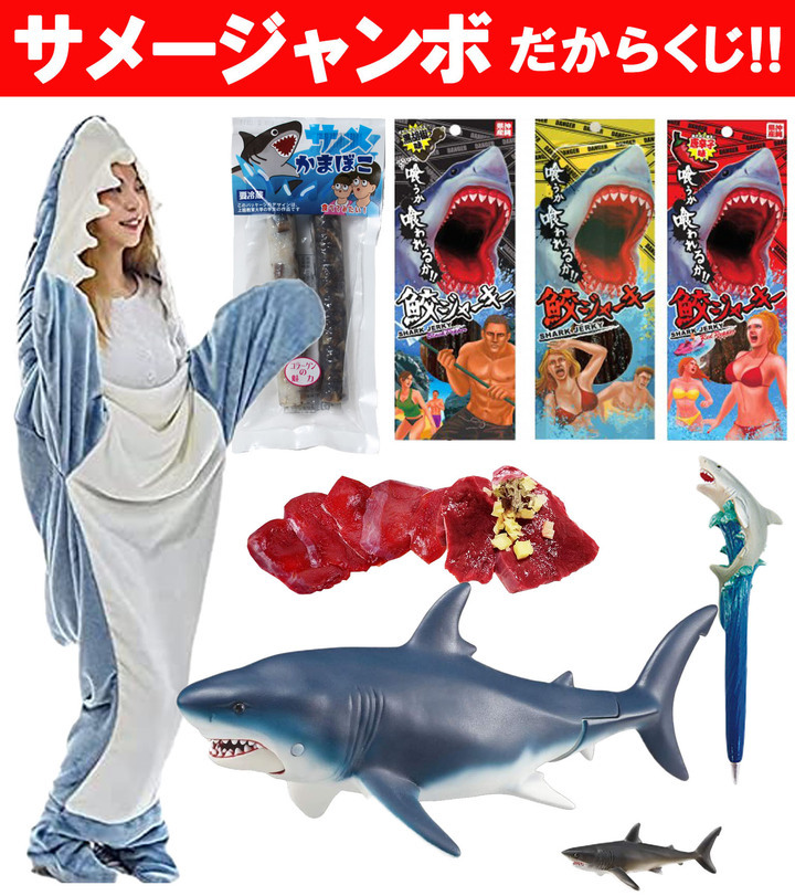 さらに驚きのサメグッズが抽選で当たる「サメージャンボだからくじ」を開催。一等賞品はサメの着ぐるみ、40cmのサメオーナメント、もうか鮫の心臓の刺身(冷凍品)など。かわいいものから、少し迷惑なものまで、サメづくしの賞品を取り揃えている。