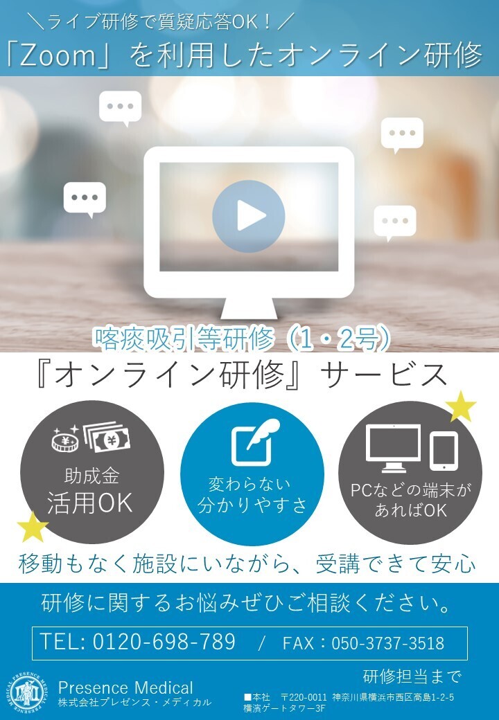 株式会社プレゼンス・メディカルは介護職員向けに喀痰吸引等研修《第1・2号研修》をコロナ禍でも安心して受講できるオンライン(ZOOM)で実施致します。
