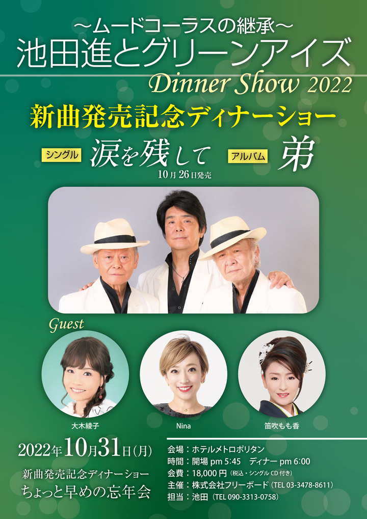 1975年に結成され今なお精力的にライブ活動を行っている日本を代表する昭和歌謡コーラスグループ「池田進とグリーンアイズ」が最新シングルと全曲集を同時発売!発売を記念して2022年10月31日(月)<池袋ホテルメトロポリタン>で新曲発売記念ディナーショーを開催する! ゲストに大木綾子、Nina、笛吹もも香を迎え、ちょっと早めの忘年会として会場を盛りあげる!