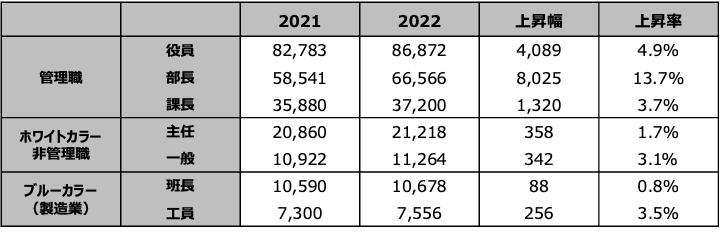 ホワイトカラー管理職の給与額(中央値)のうち、部長クラスが昨年対比+13.7%と大きく上昇し、課長クラスとの格差が開きました。一方、役員クラスおよび課長クラスの給与水準は昨年対比3~5%程度の上昇に留まっています。