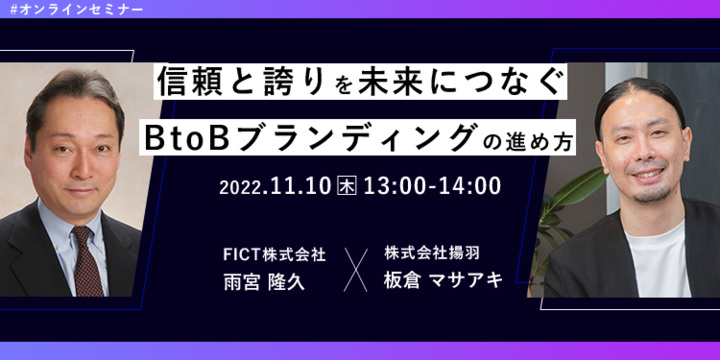 コーポレートブランディング支援を行う株式会社揚羽(東京都中央区八丁堀2丁目12-7 代表取締役社長 湊剛宏 以下、揚羽)は、2022年11月10日(木)にFICT株式会社 執行役員 チーフストラテジーオフィサーの雨宮隆久氏をお迎えし、「信頼と誇りを未来につなぐBtoBブランディングの進め方」と題したオンラインセミナーを開催します。