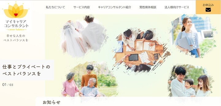 2022年10月1日~仕事とプライベートの両立支援を行う「マイキャリアコンサルタント」に男性のキャリアコンサルタントが加わり、男性育休取得希望者を対象にした仕事とプライベートの両立相談サービス(オンライン)を提供を開始しました。仕事のことも大事にしたいけれど、自分のことや家庭のこと、育児・介護のこと、副業/複業・起業、学び直しのこと、様々なプライベートのことも大切にしたい人を対象に、これからどのようなキャリア選択をしていったらよいのか、相談者の価値観を尊重しながら想いや迷いを傾聴し、今とこれからの仕事やプライベートについてのアドバイスを行っています。必要だと感じる時には利用できる安価な料金形態としています。転職を前提としない人生伴走型のオンラインキャリア相談サービスを提供して参ります。https://my-careerconsultant.com/for-men
