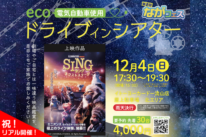 流山の地域の皆様と商工事業者を結ぶ、地元発見イベント『第2回 ながフェス』を開催します。リアルとオンラインのハイブリッドで開催することにこだわった企画となっております。 リアル開催は 2022年12月4日(日)イトーヨーカドー流山店屋上駐車場にて開催される『流山ノスタルジックecoパーク』『流山ecoドライブインシアター』『わくわくショッピング街』『ちばキャラ大集合』、オンライン開催は 2022年12月から2023年3月31日まで続く『VR流山産業博』『キッズダンスオンライン発表会』『ながれやマンゲームプログラミングコンテスト』となっております。 これらリアルとオンラインで開催されるイベントの集合体が『第2回ながフェス』です。