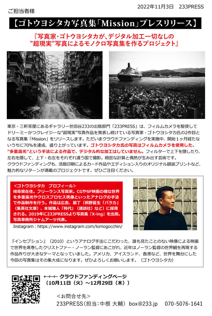 東京・三軒茶屋にあるギャラリー世田谷233の出版部門「233PRESS」は、フィルムカメラと多重露光という手法をを駆使し、ドリーミーかつクレイジーな写真作品を発表し続けている写真家・ゴトウヨシタカ氏の2作目となる写真集「Mission」をリリースします。