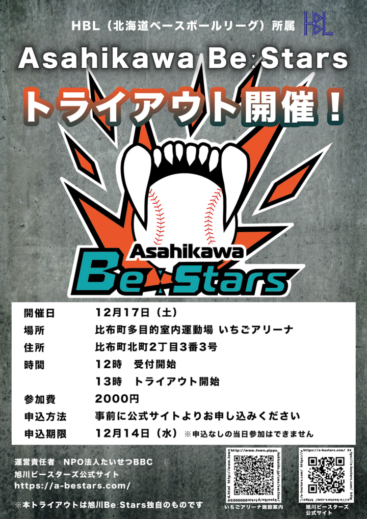旭川ビースターズ独自のトライアウト開催が決定いたしました。北海道ベースボールリーグ(HBL)合同トライアウトは2022年11月5日に開催されましたが、今回は旭川ビースターズが主催するトライアウトになります。旭川で活躍を目指す選手のみなさま、是非ご参加ください!