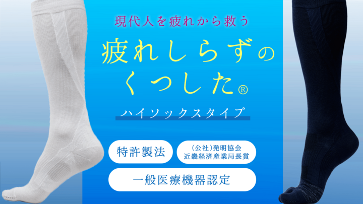 現代人を疲れから救い、日常生活や趣味をワンランク快適にする「疲れしらずのくつした」から一般医療機器認定のハイソックスタイプが登場。15の選りすぐりの機能!むくみ軽減・血行促進対策に対応しました。