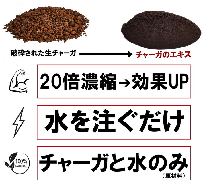 更に、Arctic Natural(株)のチャーガエキスは100%ナチュラルです。LiveExtracts®の技術によるエキス化では低温の水のみが使用されているので、チャーガ自体に含まれていない物質を一切加えない上に、高温の処理による有効成分の破壊を回避できます。Arctic Natural(株)のチャーガエキスの原材料は、チャーガのキノコ自体と水のみです。