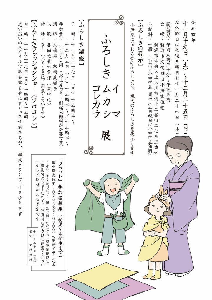 小澤家は、江戸時代後期には「小澤屋七助」と名乗り米穀商を営んでいました。 明治時代の初めに当主は「七三郎」と改名し、回船経営に乗り出します。以後、運送・倉庫業、回米問屋、地主経営、石油商と様々な事業に進出し、新潟を代表する商家の一つとなりました。また、歴代当主は新潟の政財界の要職で活躍しました。(旧小澤家住宅HPより引用)12月25日(日)まで小澤家に伝わるふろしきと現代のふろしきの展示会を開催中です。大嶋屋・大嶋美樹子(有限会社:大嶋屋呉服店)が、ふろしきの展示、使い方講座、子供のふろしきファッションショー・フロコレ企画を担当。