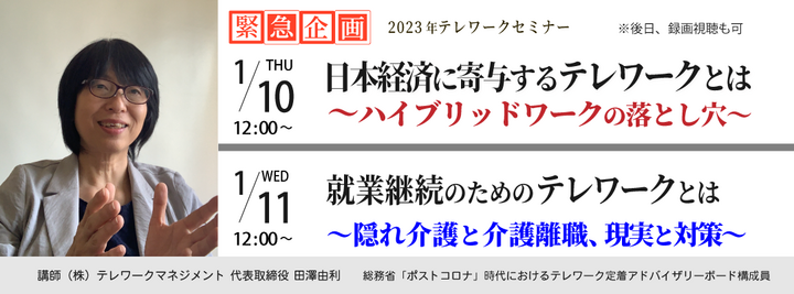 テレワークの第一人者・田澤由利が代表を務める(株)テレワークマネジメントが『経済』『介護』をテーマに2日間(1/10・11)のセミナーを開催|後日録画視聴も可