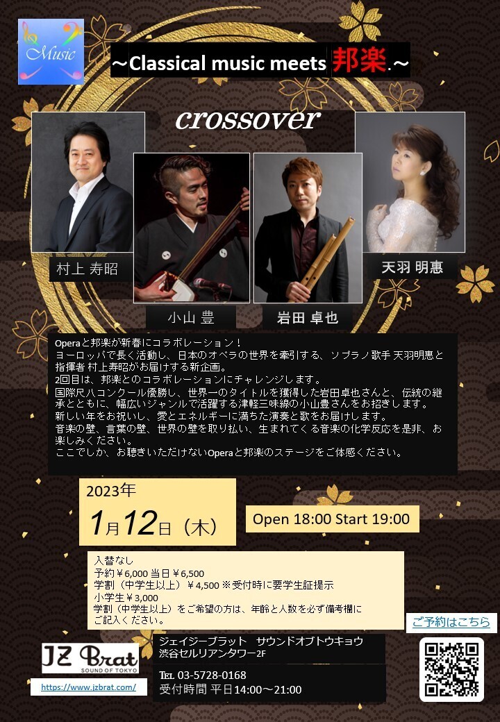 1月12日、ジャズクラブJZ Bratにて。Operaと邦楽が新春にコラボレーション!ソプラノ歌手 天羽昭惠と、指揮者 村上寿昭がお届けする新企画、「クロスオーヴァー」。シリーズ第2回目は邦楽とコラボ。尺八の岩田卓也さんと、津軽三味線の小山豊さんをお招きします。