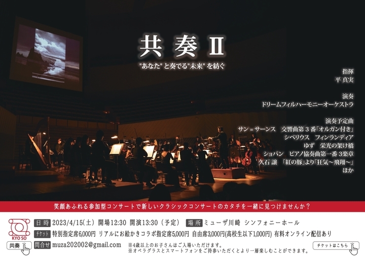 司会が進行するスタイルで、オーケストラの演奏をベースに、お客様参加型企画やアートとのコラボなど、さまざまな「共に奏でる」を実験的に企画する「ドリームフィルハーモニーオーケストラ」は、4月15日に開催する共奏Ⅱのチケット販売を、2023年2月1日(水)より開始します。