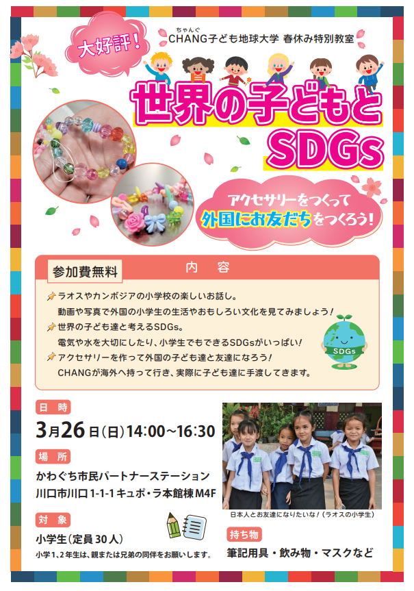 一般財団法人CHANG(チャング)アジアの子供財団(本部:埼玉県川口市、理事長:後藤範泰)は2023年3月26日(日)午後2時から、埼玉県のかわぐち市民パートナーステーション(キュポ・ラ本館棟M4F)で小学生向けの参加費無料イベント「CHANG子ども地球大学 春休み特別教室『世界の子どもとSDGs』」を開催します。当日は楽しいクイズと、ラオスやカンボジアで活動しているスタッフが撮影した写真や動画で現地の面白い文化や、小学校に通う子どもたちの生活を紹介。同様にクイズを交えながら小学生でもできるSDGs(持続可能な開発目標)についても学びます。そして海外の子どもたちにプレゼントするアクセサリーをつくり、後日実際にスタッフが海外で手渡しをして「海外に友達をつくろう」という、日本と海外の小学生の国際交流を図り、小学生からSDGsについて考えるきっかけになる人気イベントです。