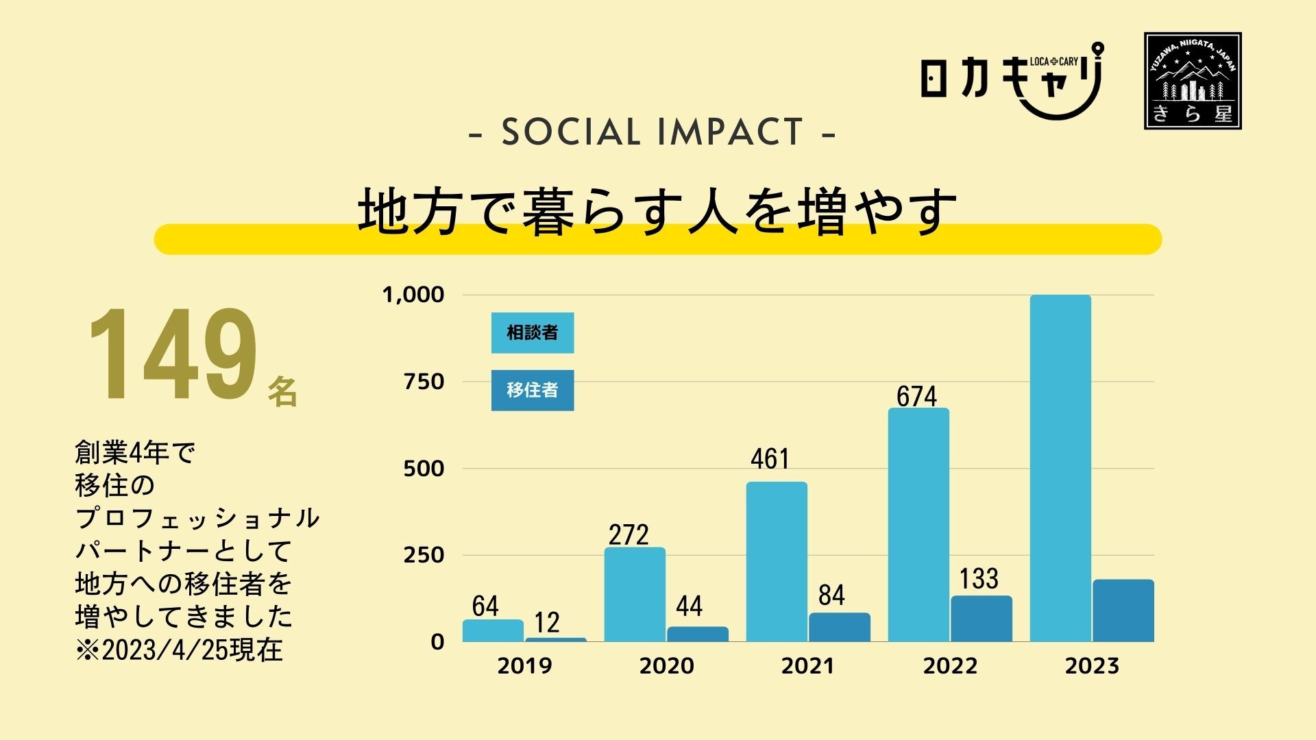 きら星は「地方で暮らす人を増やし、消滅可能性都市をなくす」ことを目標に活動をしているローカルベンチャーで、代表の伊藤が2019年2月に創業しました。地方での暮らしや仕事を楽しみ、一人ひとりがきら星のように輝ける地域を広げることを目指し、地場の職業紹介や起業支援など多様な就労形態の提案から、移住に関わる住宅や補助金などさまざまな情報提供まで、きめ細かな移住支援サービスを提供しています。これまで魚沼エリアを中心に149名(2023年4月25日現在)の移住を実現させているほか、2023年4月には燕三条に新拠点を設置するなど、積極的に活動を進めています。