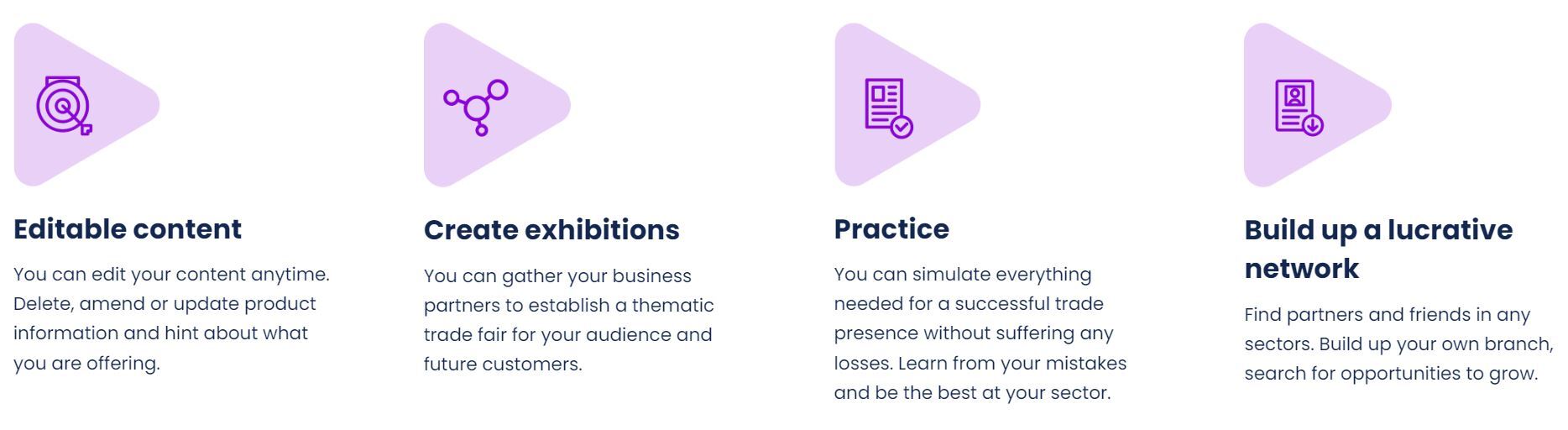 DTCH内機能の一つであるーチャル・トレードフェアの利点として、コンテンツの編集、削除、情報の更新ができること、展示会を作成し、ビジネスパートナーを集めて顧客向けのテーマ別展示会を作ることができること、費用をかけずに商材紹介の試行をしたりする事があります。 また、自社の支店を設立したり、さまざまな分野でパートナーを見つけ、企業成長の機会を探る場所でもあります。