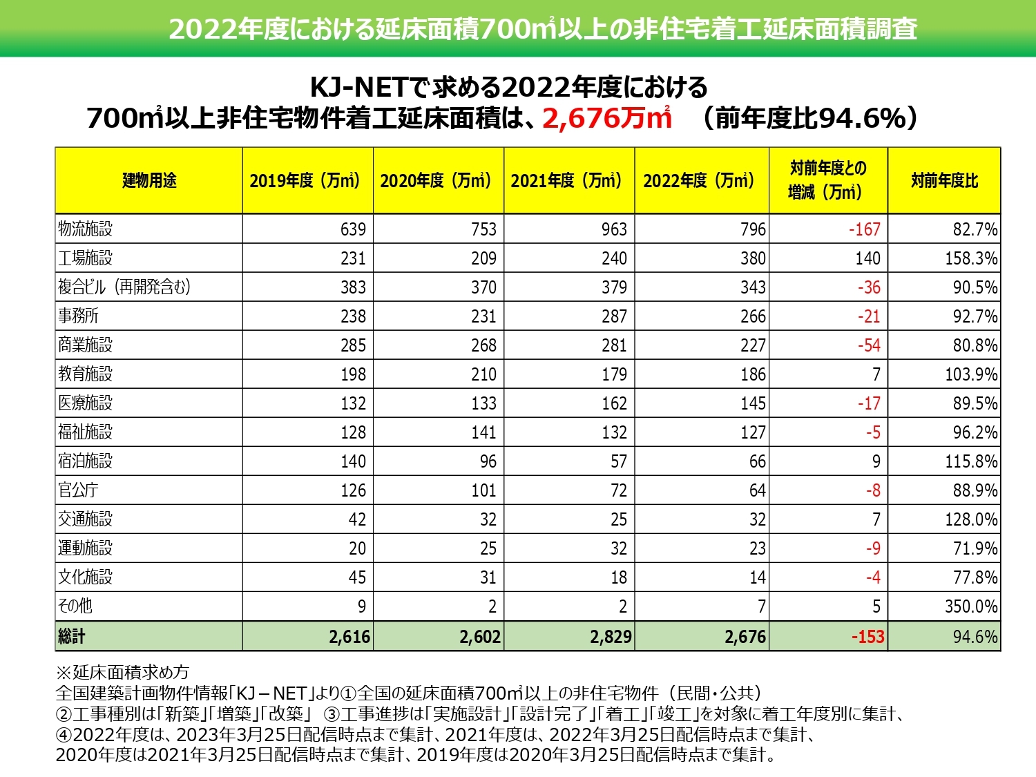KJ-NET2023年3月配信時点での2022年度における延床面積700㎡以上の非住宅着工延床面積は、2,676万㎡となる。これは、前年度の同時期(2022年3月配信時点)と比較すると153万㎡減(対前年度比94.6%)となる。