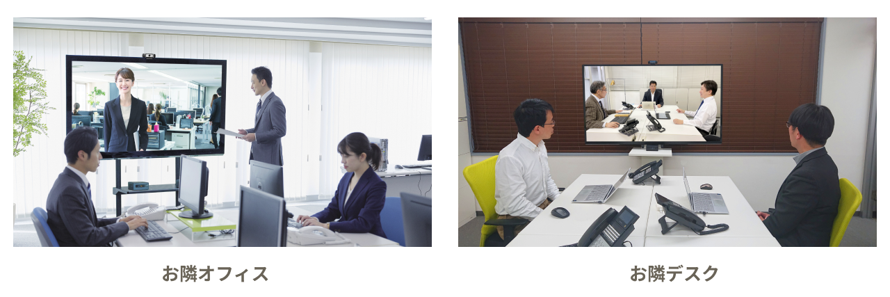 離れたオフィスがまるでテレビモニターを通じて“お隣”にいるような環境になるので、お互いの様子が手に取るようにわかり、例えば、急ぎの仕事の状況報告や決裁判断を仰ぐことを、上長の在席状況を確認してすぐに行うことが可能になったり、朝礼や終礼など全社が一同に会して意思疎通を図る機会を簡単に設けることが可能です。