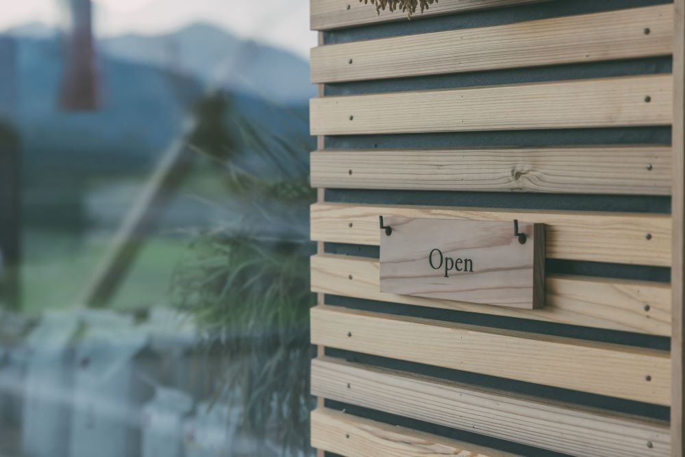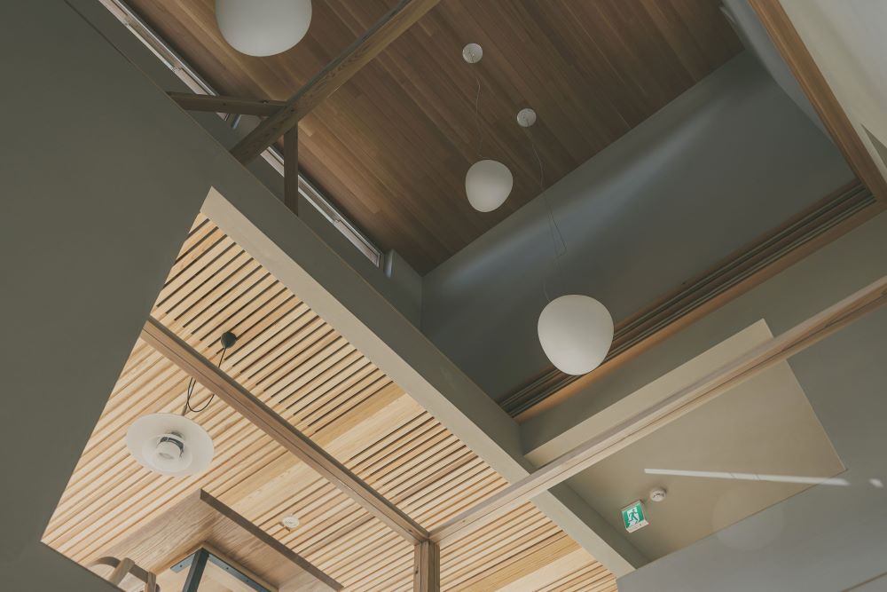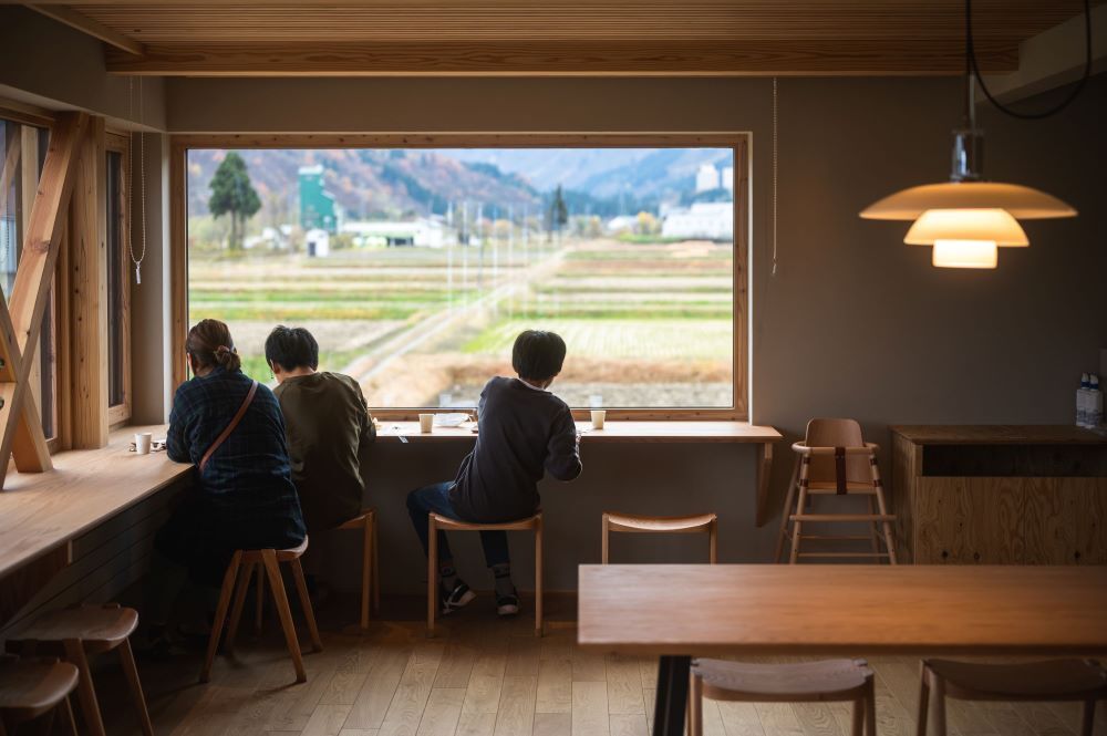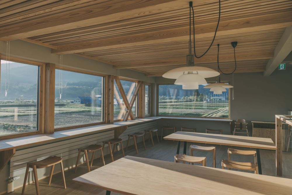 また2階飲食スペースではパノラマに拡がる木製サッシの窓から田園風景や山々が眺められます。