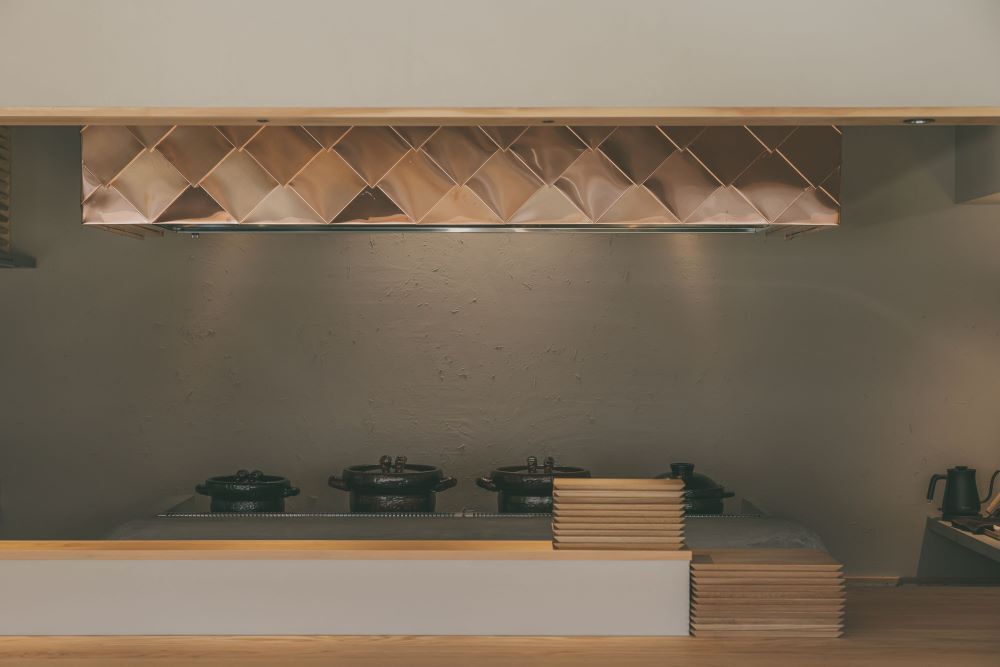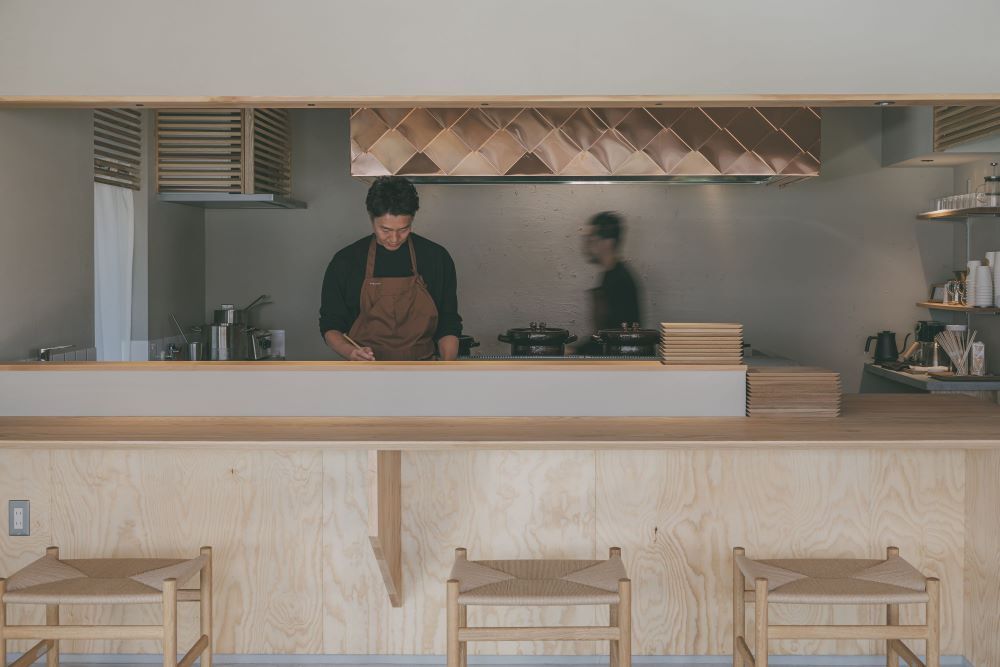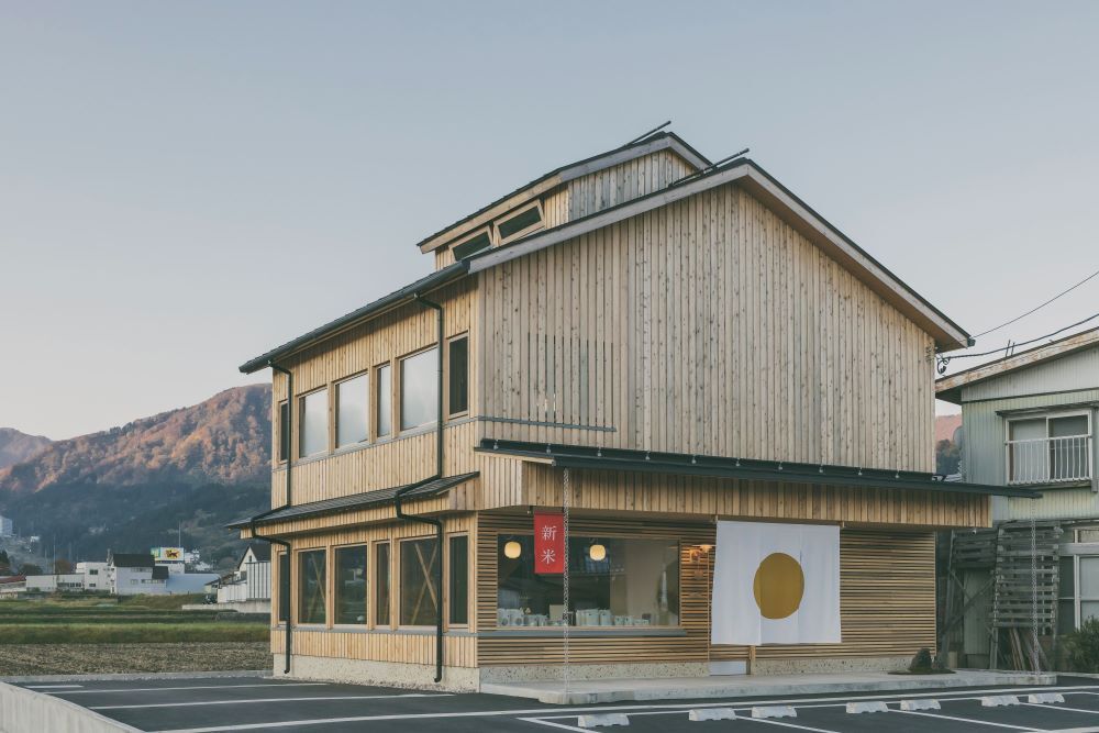 関農園のブランドロゴである金丸をあしらったおおきな暖簾。建物すべてにストーリーがある建築を目指し、南魚沼の田園風景に溶け込むように地場産の越後杉であしらわれた無塗装の木製外壁が特徴の外観になっております。内装も本物にこだわり、無垢の木と土壁を主体にしブランドカラーである金を土間の真鍮目地やトイレ、2階誘導サインなどにあしらっています。お客様から見えるように設計したオープンキッチンではモルタルのガス台で土鍋で炊くところや握っている所が見えるようになっております。銅板をひし牽きにしたレンジフードも特徴です。家具や照明は北欧の物を使用しシンプルだが洗練されたインテリアになっています。