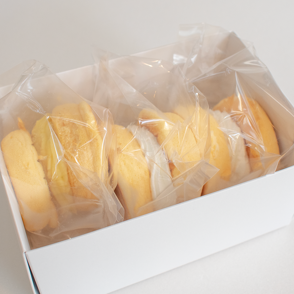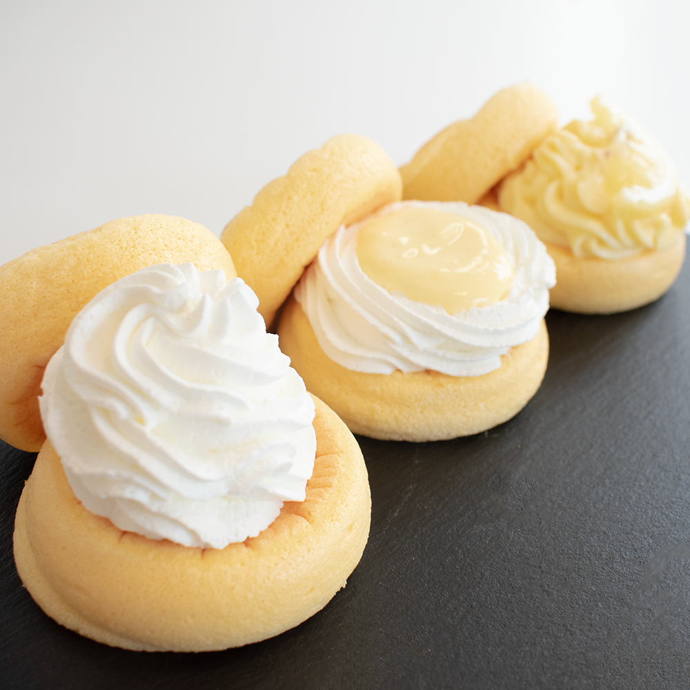 今回のシリーズ最新作は、当店自慢の生クリームを使用した「プレーン」に加え、特製カスタードクリームと生クリーム入りの「カスタード生クリーム」レモンの酸味が効いた爽やかなカスタードクリーム入りの「レモンカスタード」の計3種類がセットです。冷蔵庫に2時間半で半解凍となり、まるでアイスケーキのような食感に。冷蔵庫で3時間、全解凍するとふわふわ食感を楽しめます。