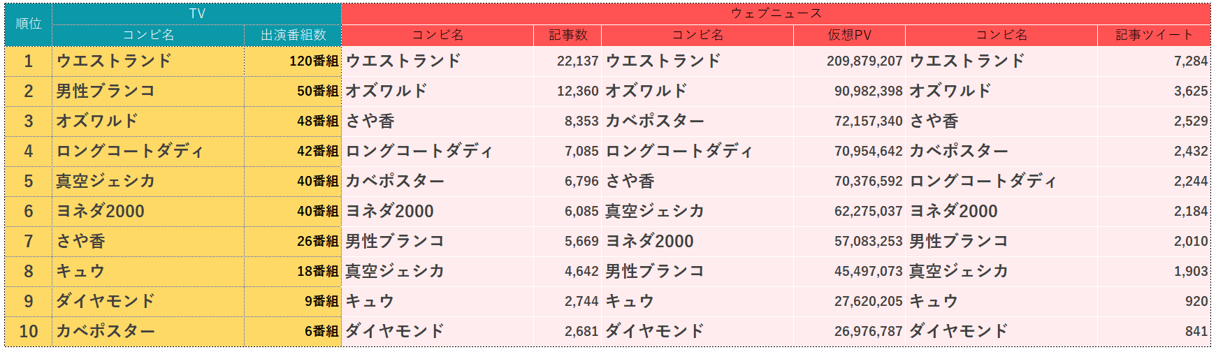 ランキングでは「M-1GP 2002」チャンピオンの「ウエストランド」が関東エリア・関西エリア共にTV番組出演回数で第1位、ウェブニュースでの記事数、仮想PV数、記事ツイート数全てにおいて堂々の第1位となりました。ウェブニュース第2位はオズワルドとなりましたが、関東エリアのTV番組出演回数では、「M-1GP 2002」決勝前から定期的に出演しているTBS「ラヴィット!」への引き続きの定期出演や、その他の多くのゲスト出演で回数を伸ばした「男性ブランコ」が(関東エリア)第2位。関西エリアのTV番組出演回数では、ABCテレビ「newsおかえり」やMBS毎日放送「せやねん!」といった関西エリアで多くのレギュラー番組を持ち、「M-1GP 2002」決勝以後も引き続きのレギュラー出演や、多くの関西エリアTV番組への出演を重ねた「さや香」が(関西エリア)第2位となりました。