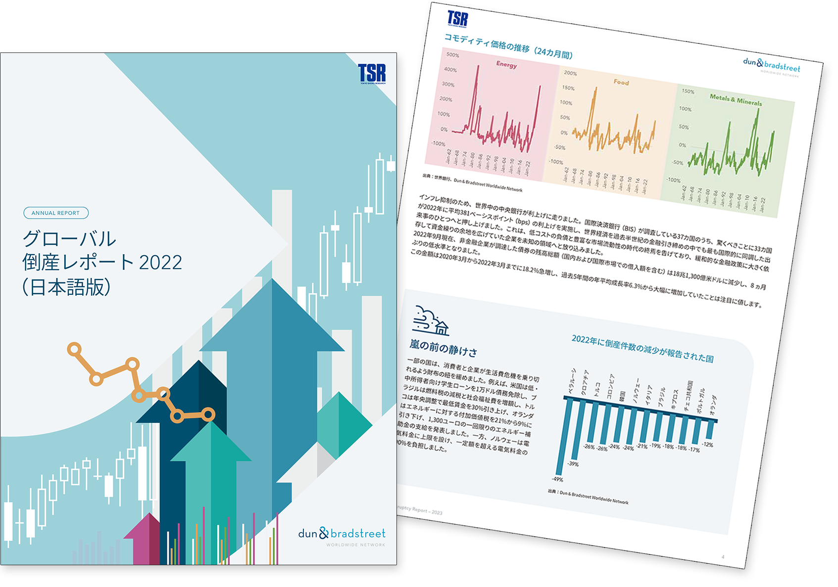 株式会社東京商工リサーチ(以下TSR)は、提携先である世界最大級の企業情報プロバイダー、米国のDun&Bradstreet (以下D&B)が世界48カ国における最新の倒産件数を集計した「2022年 グローバル倒産レポート(日本語版)」の無償提供を開始いたしました。本レポートは、TSRのHPから無料でダウンロードすることが可能です。海外ビジネスに携わるさまざまな企業の担当者の方にご活用いただけます。