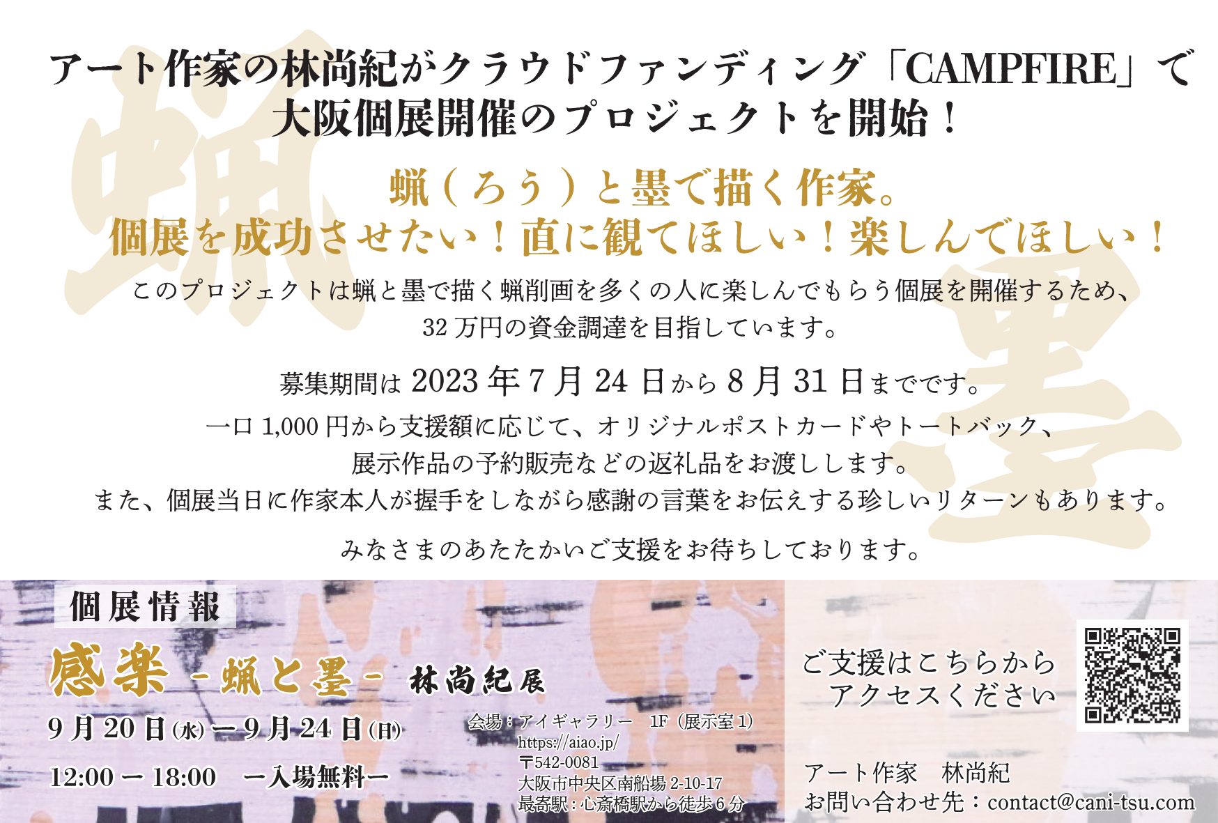 ▼ 蝋(ろう)と墨で描く作家。個展を成功させたい!直に観てほしい!楽しんでほしい!|クラウドファンディングページ(CAMPFIRE):https://camp-fire.jp/projects/682443/preview?token=n0nqglaj&utm_campaign=cp_po_share_c_msg_mypage_projects_show