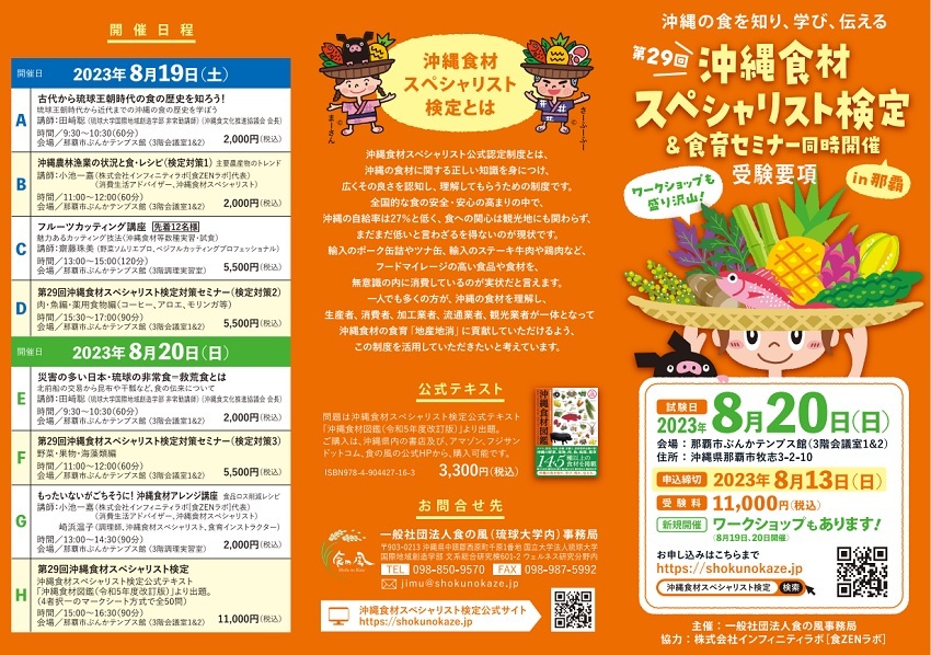 沖縄食材等を使った五感で楽しむレシピ・コラム等を配信している食情報メディア『食ZENラボ』(運営会社:株式会社インフィニティラボ 那覇市 代表:小池 一嘉)と『沖縄食材スペシャリスト検定』を運営する一般社団法人食の風(沖縄県豊見城市、代表理事:田崎 聡)は、共同で2023年8月19日(土)・20日(日)の2日間に渡り、【第29回沖縄食材スペシャリスト検定&食育セミナー】を開催いたします。