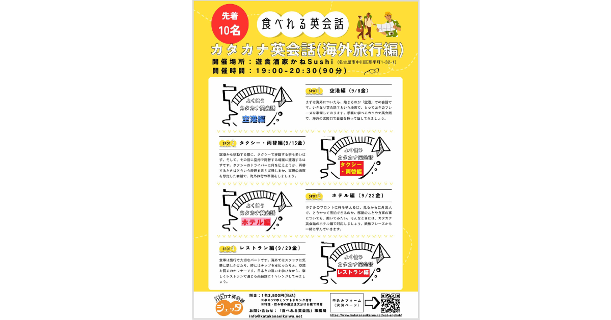 通じる英会話「カタカナ英会話」を開発した株式会社JETTA(所在地:愛知県名古屋市、代表取締役:長谷川雄一朗、以下「JETTA」)は、飲食店で食事をしながら気軽に英会話が身につくイベント「食べれる英会話 カタカナ英会話(海外旅行編)」を9月8日(金)・9月15日(金)・9月22日(金)・9月29日(金)に開催いたします。