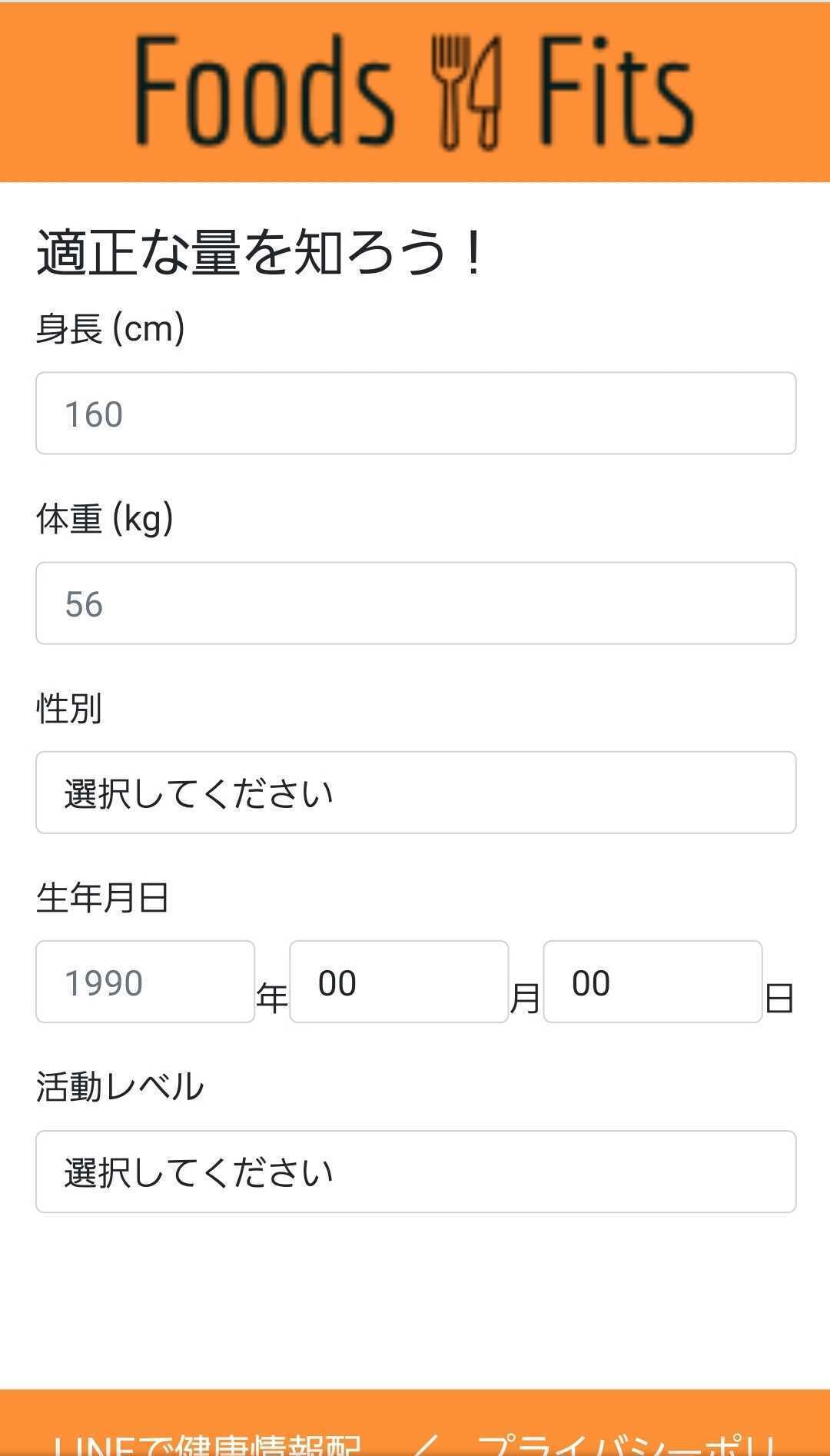 ・身長、体重、性別、生年月日、活動レベルを入力します。