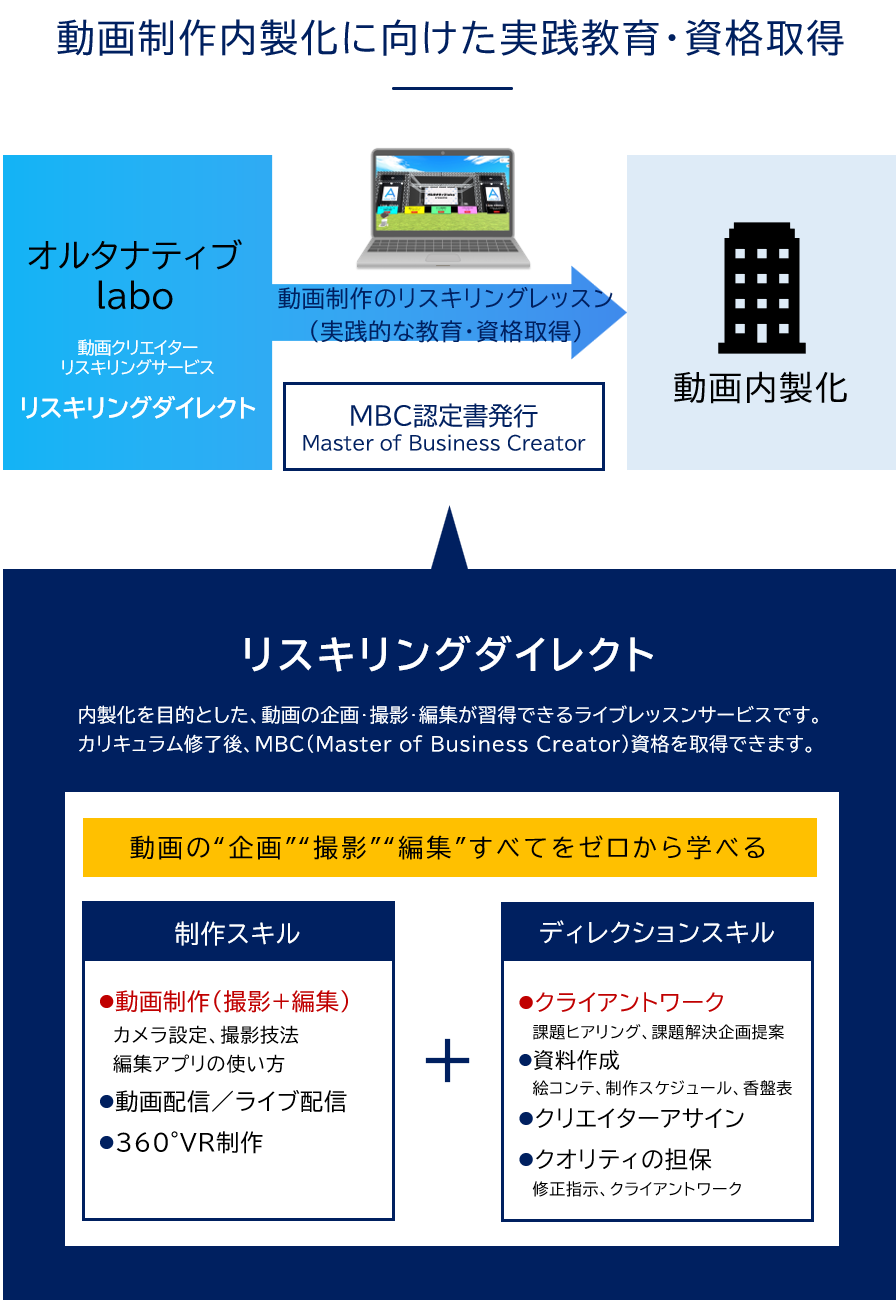法人向け映像・動画制作サービスなどを手がける株式会社オルタナティブlabo(本社:東京都江東区、代表取締役:木戸 卓樹)は、動画クリエイターを育成・内製化するサービス「リスキリングダイレクト」を2023年9月11日(月)から提供します。加速する動画制作の内製化ニーズに対応するため、動画制作スクール「A-labo.大学」のコースを活用。従業員・職員のリスキリングを通して、動画コンテンツの内製化をサポートします。