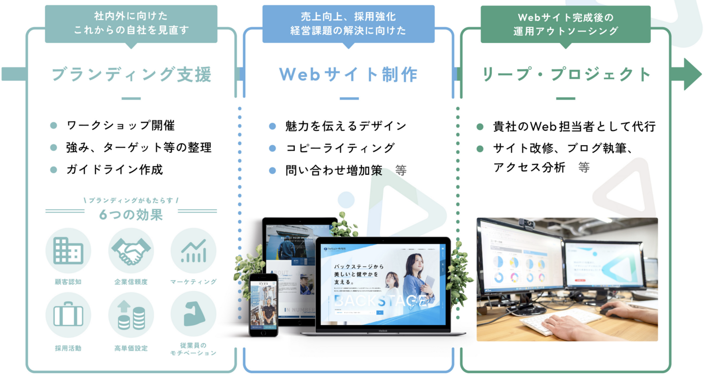 ■ブランディング支援、Webサイト制作、完成後の運用アウトソーシングまでを提供。 お客様の成功を伴走型で支援します。