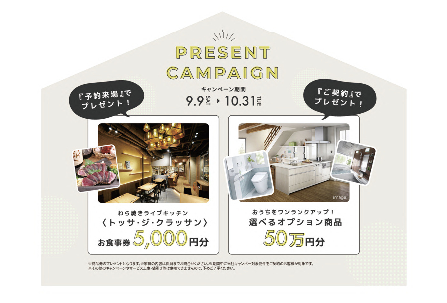 予約来場でお食事券・ご成約で設備50万円分(消費税込)プレゼント!