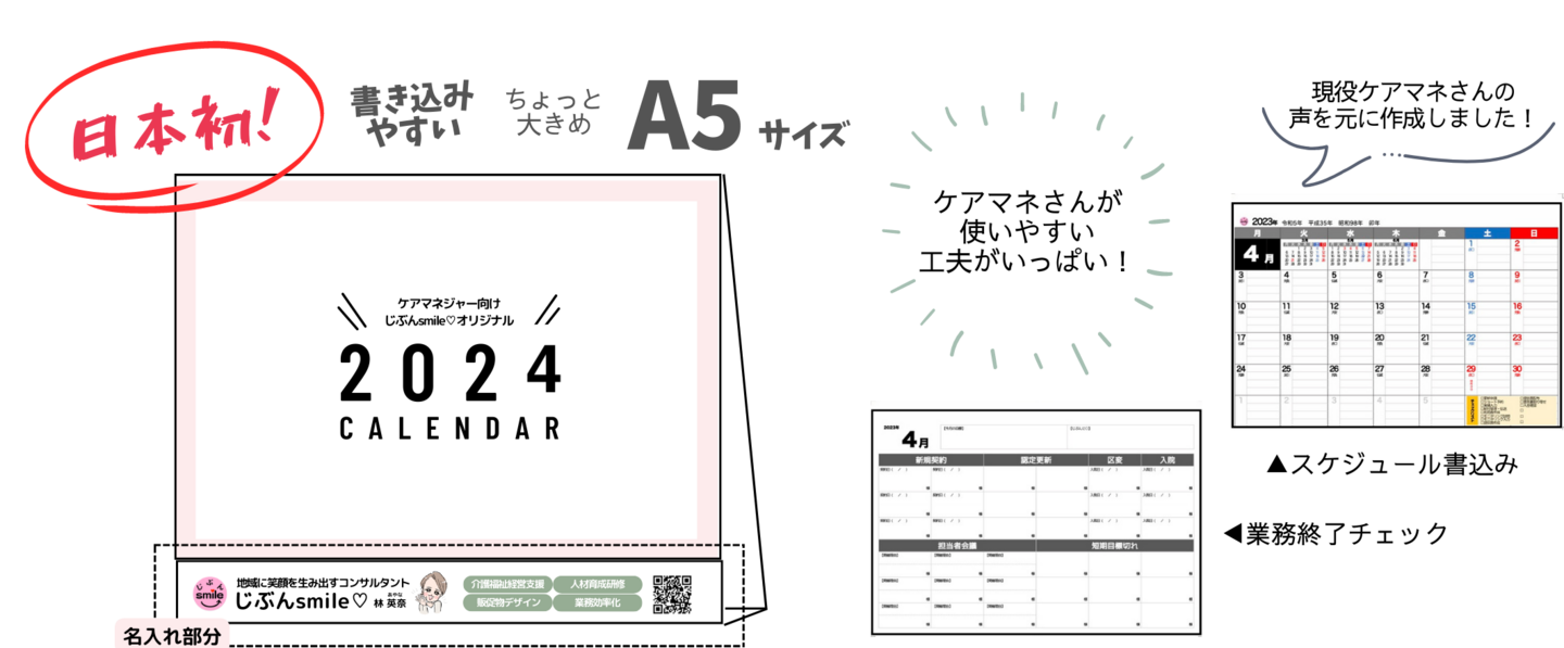 ケアマネジャーにとって必須のスケジュール管理・業務管理・自己管理ができる日本で初めてのケアマネ向け「卓上カレンダー」。業務終了チェックや加算管理のためのメモなど、毎日の業務の中で役立つ機能を掲載。じぶんsmile♡(本社:神奈川県藤沢市/代表:林英奈)は、2023年10月1日から、ケアマネジャー向けスケジュール管理ツールとしては初めて(*1)となるケアマネジャー向け卓上カレンダーを、オンラインショップで発売します。(9月1日より予約受付中)
