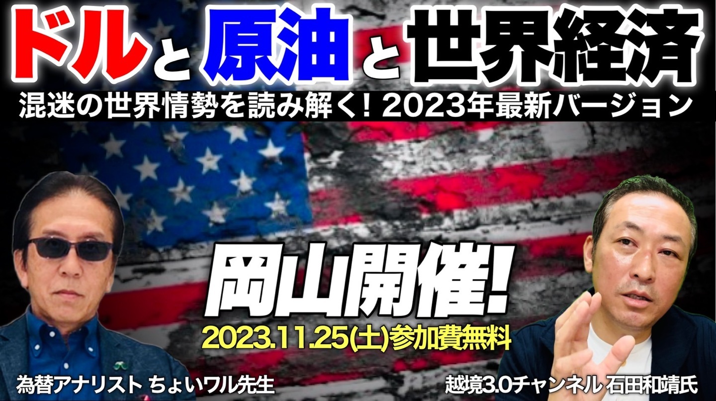 金融商品取引サービスを提供する岡安商事株式会社(本社:大阪市中央区、代表取締役社長:杉本良隆)は2023年11月25日(土)、岡山市・岡山コンベンションセンターにて、特別セミナー『ドルと原油と世界経済 2023最新バージョン』を開催します。